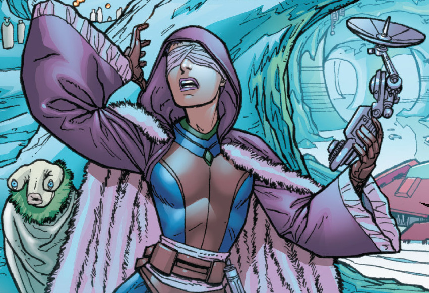 Zayne and Gryph catch up to Celeste and they all infiltrate Pulsipher’s lab. Somehow, Gryph fires a rifle into the ceiling multiple times, causing a thousand tons of mountain ice to collapse on top of him. “He’ll be fine,” says Celeste. But the commotion brings a group of Mandalorians to investigate. The Jedi identify the leader as one of the warriors from the ship they came in on based on the distinctive markings on his armor. But if you go back and look at all the Mandalorians who were on the ship, none of them have that armor. Oh…